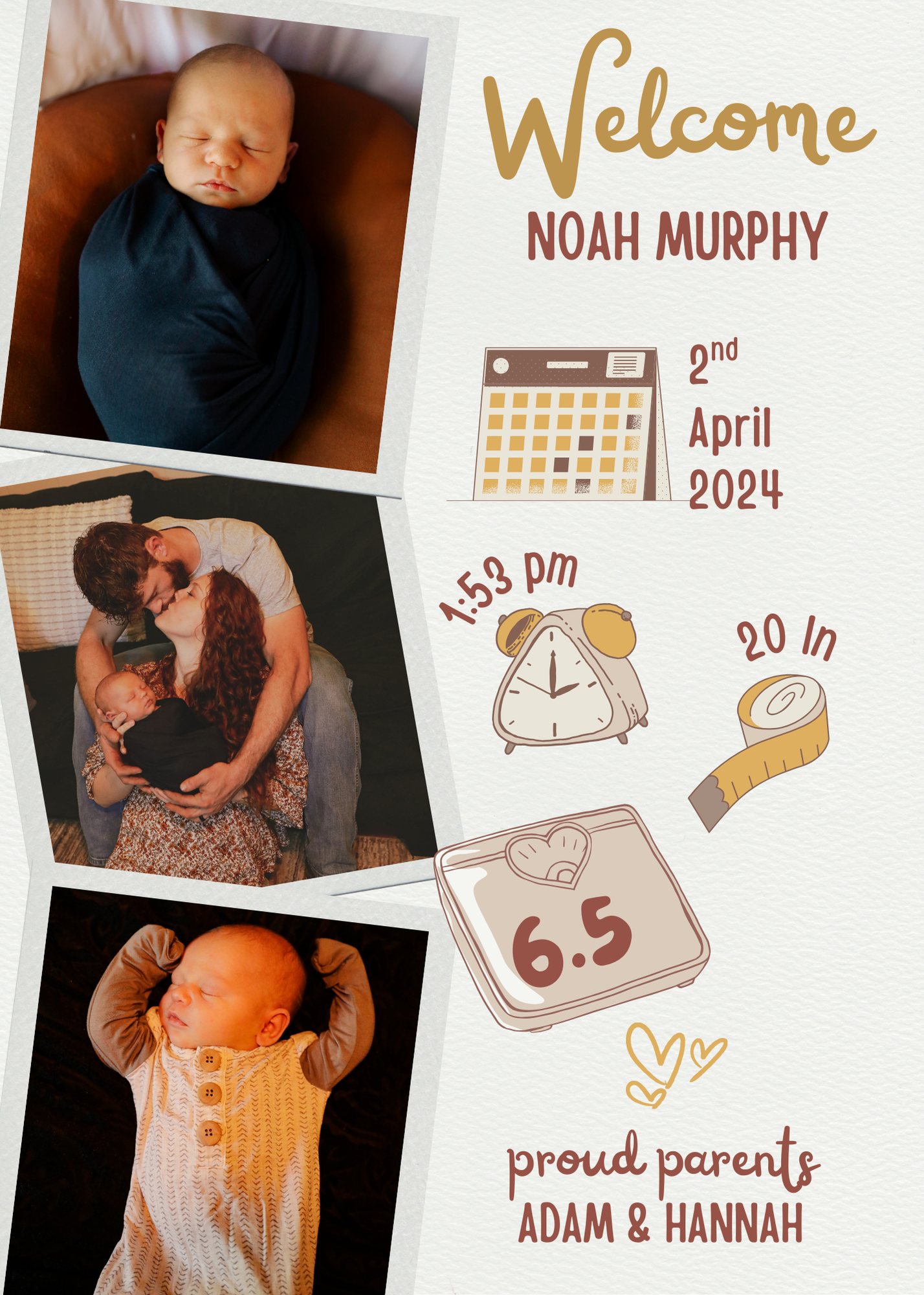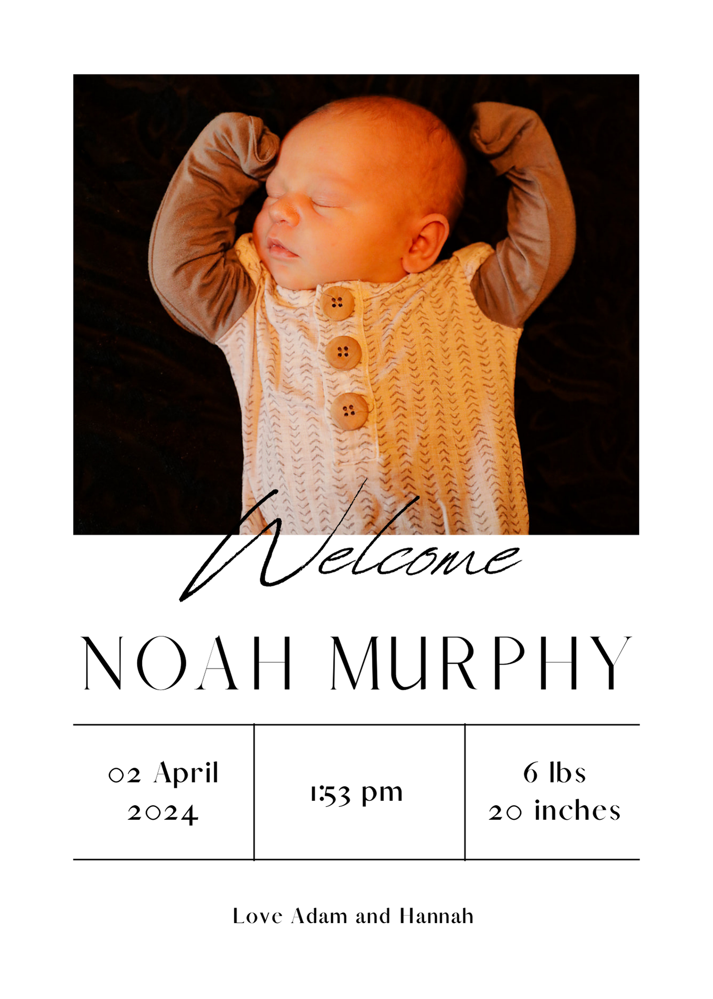 Share your joyful news with this beautifully minimal baby announcement. Designed with a clean, modern layout, it highlights your baby’s photo and details in the most simple, elegant way. Perfect for mailing, framing, and sharing with loved ones.